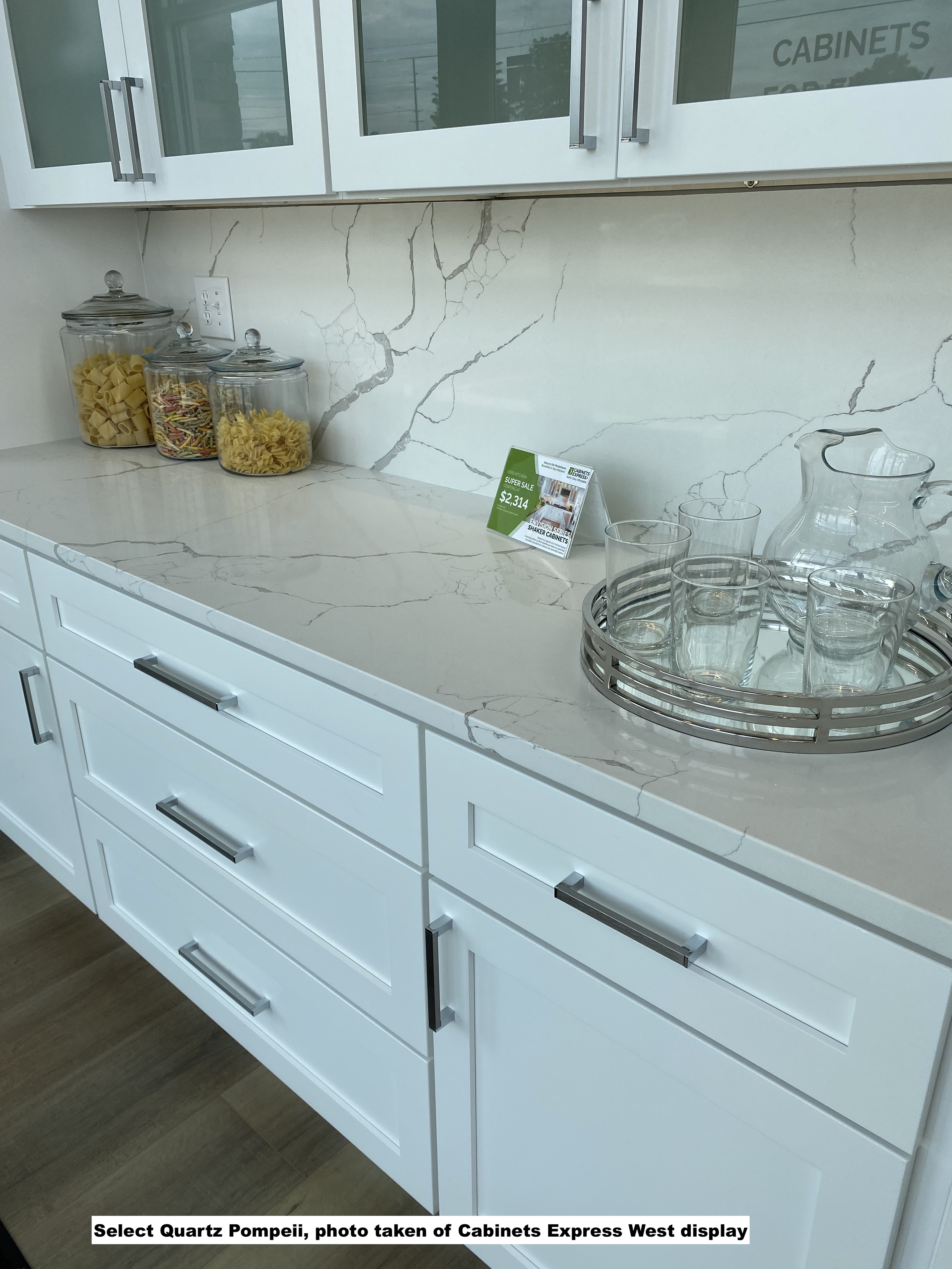 Medium-wide warm grey Calacatta type veining with thin brown accents along the veins on warm white, almost speckless background